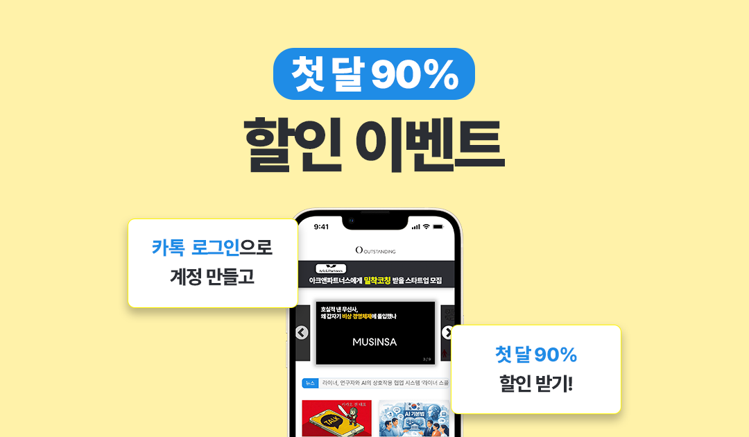 아웃스탠딩이 새로운 이벤트를 준비했습니다. 첫 달 구독료를 90% 할인하는 프로모션입니다. 첫 달에 한해 1만3900원 구독료를 1,390원으로 할인해 드립니다. (중복참여 방지를 위해 카카오톡 로그인 사용자만 이용 가능합니다)